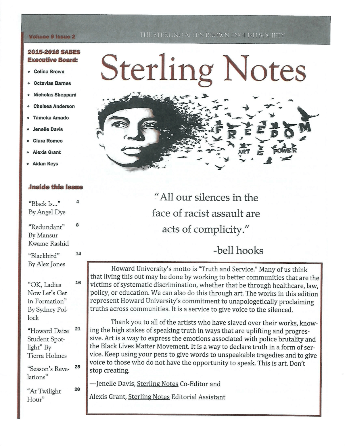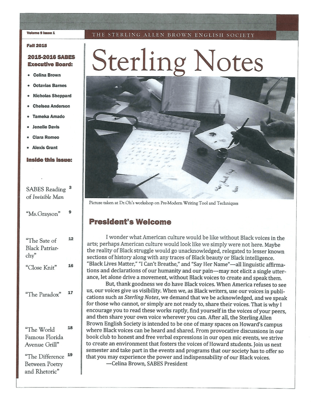 The Sterling Allen Brown English Society (SABES) is an officially recognized on-campus organization whose goal is to build community among English students and lovers of literature and related fields. It does so by creating opportunities for extracurricular enrichment, with events including open mics, film screenings with panel discussions, and book talks, as well as workshops by English professors and other faculty, lectures, and social activities such as an English-themed game night. SABES also undertakes volunteer and service activities, and it produces an online newsletter entitled Sterling Notes. Events hosted by SABES vary based on membership input and desire, and past events have included group attendance of a play, hosting a recognized poet, having a book drive, holding a book club, and sponsoring a writing contest for middle school students. Membership and offices in the Society are open to students from across the university, and all are welcome to SABES events.